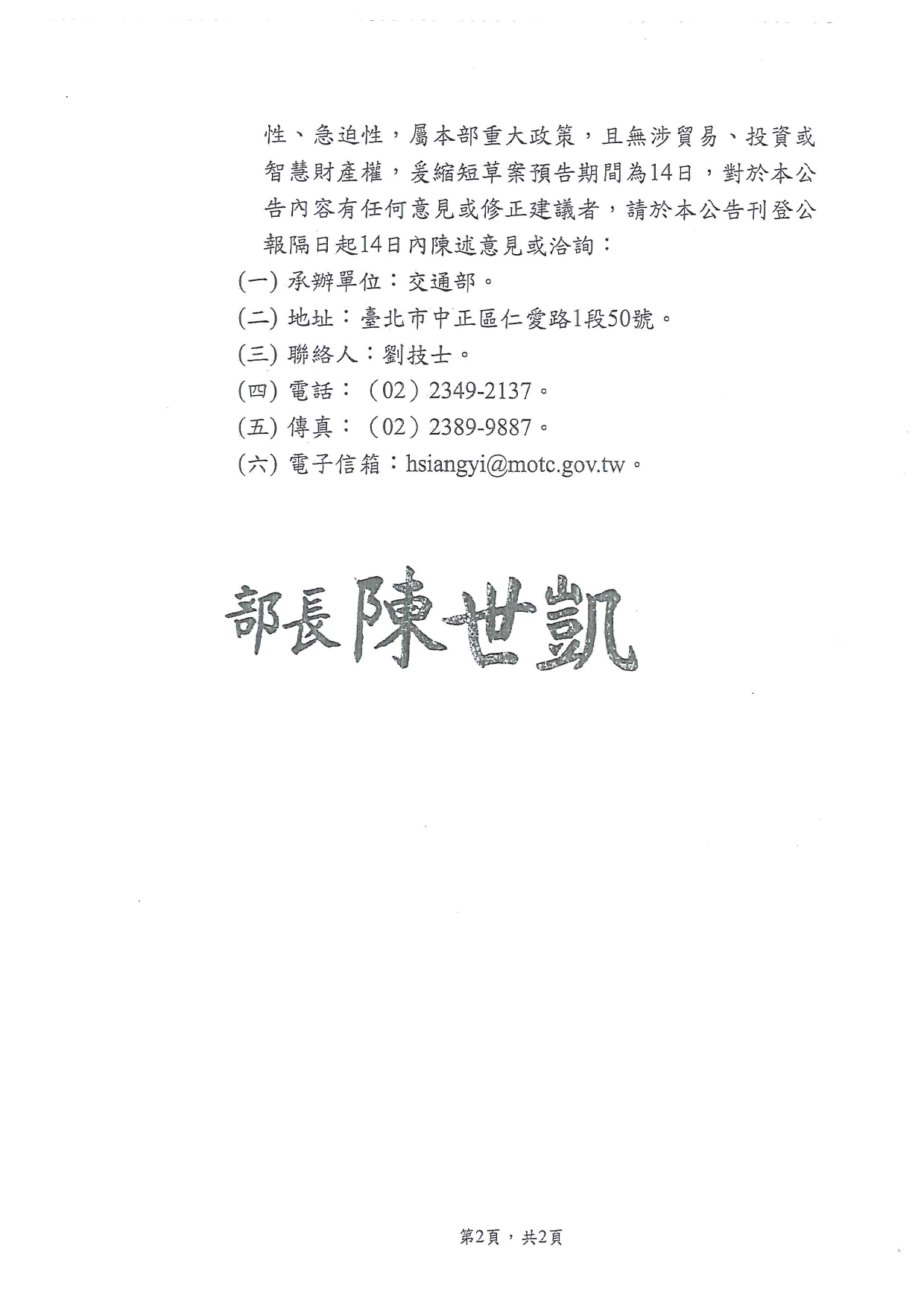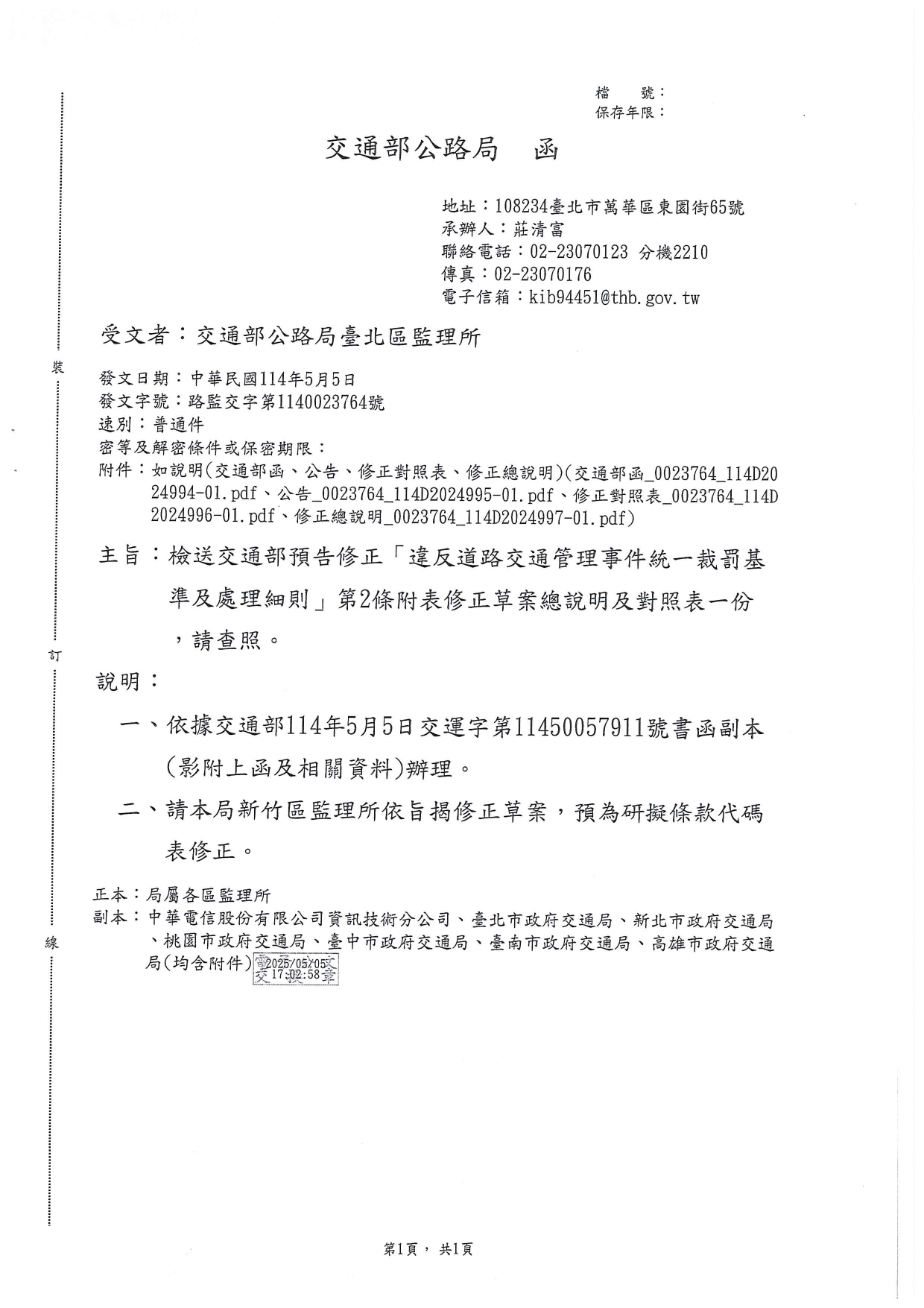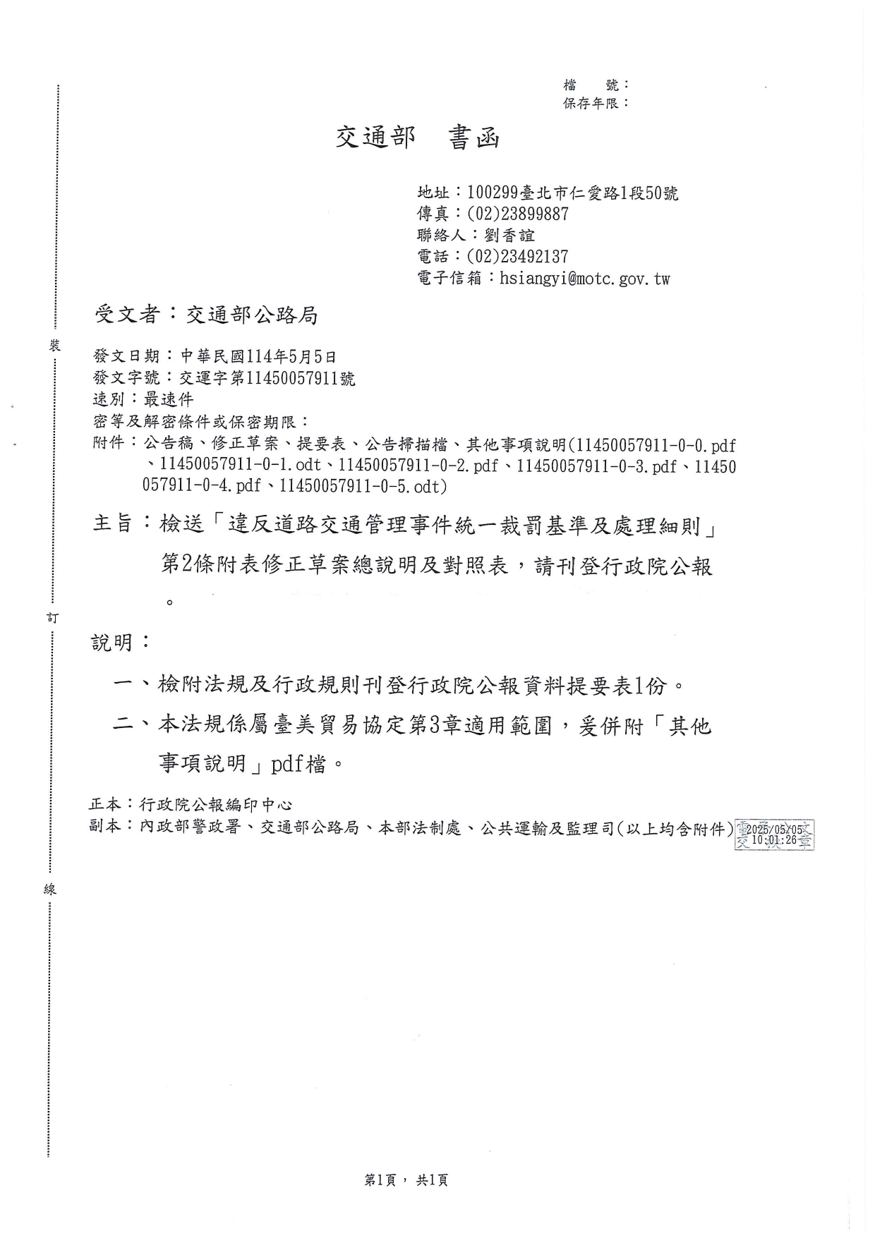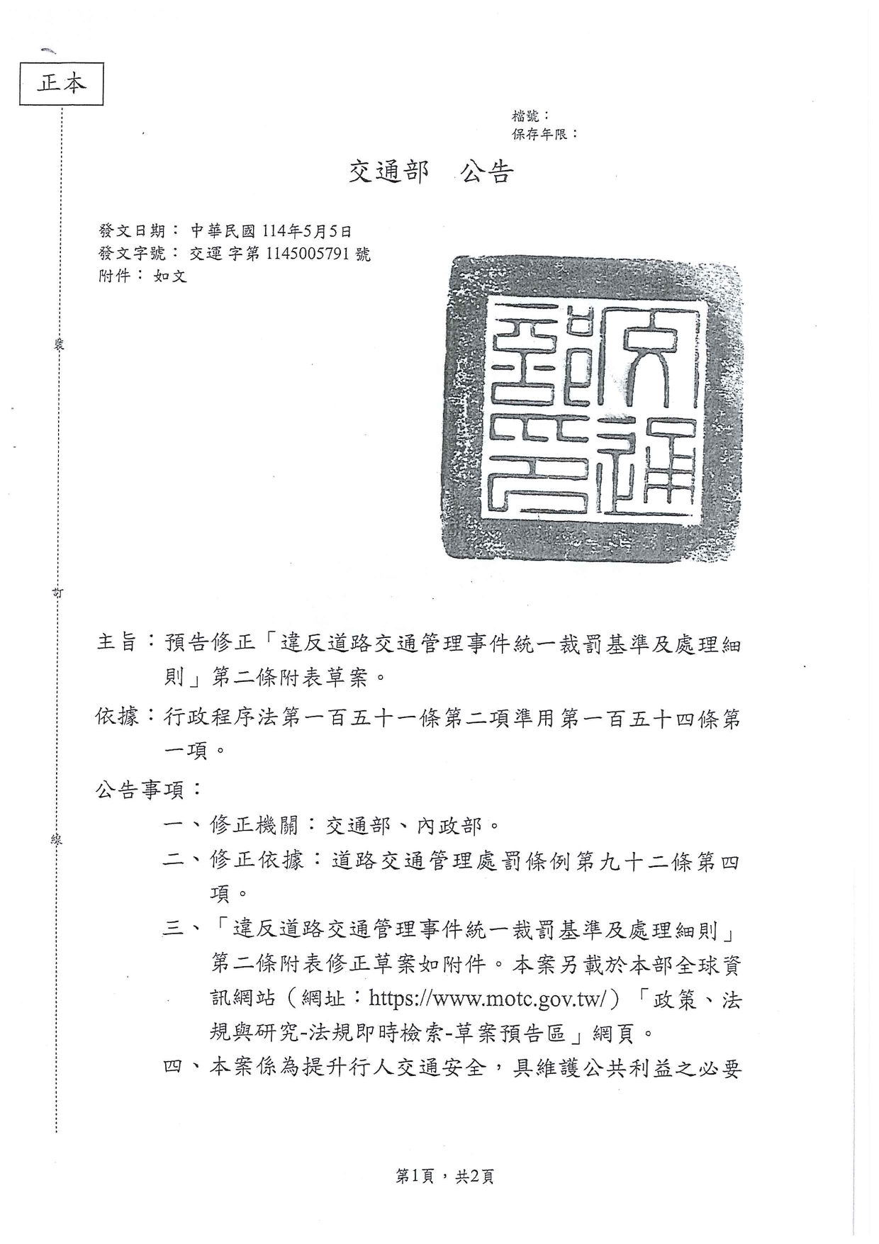 預告修正違反道路交通管理事件統一裁罰基準及處理細則第2條