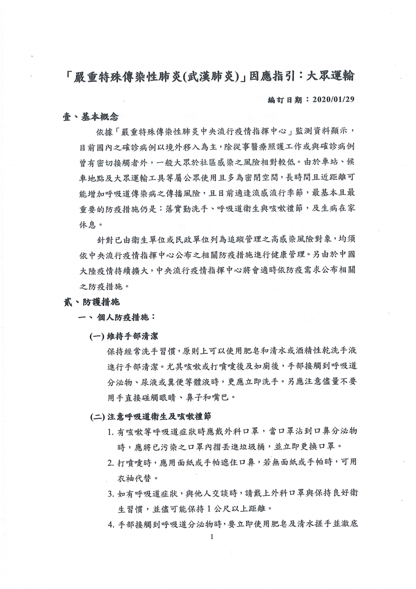 大眾運輸及企業因應嚴重特殊傳染性肺炎疫情持續營運指引