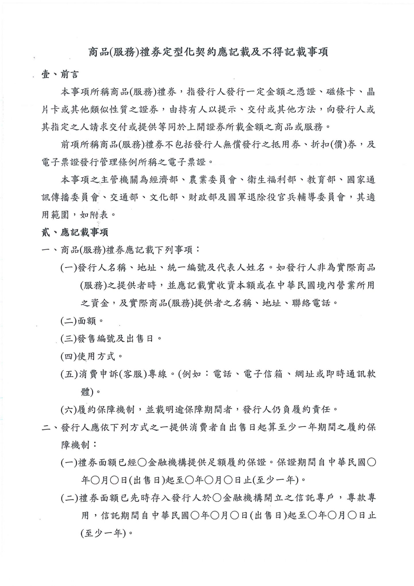 商品(服務)禮券定型化契約應記載與不得記載事項