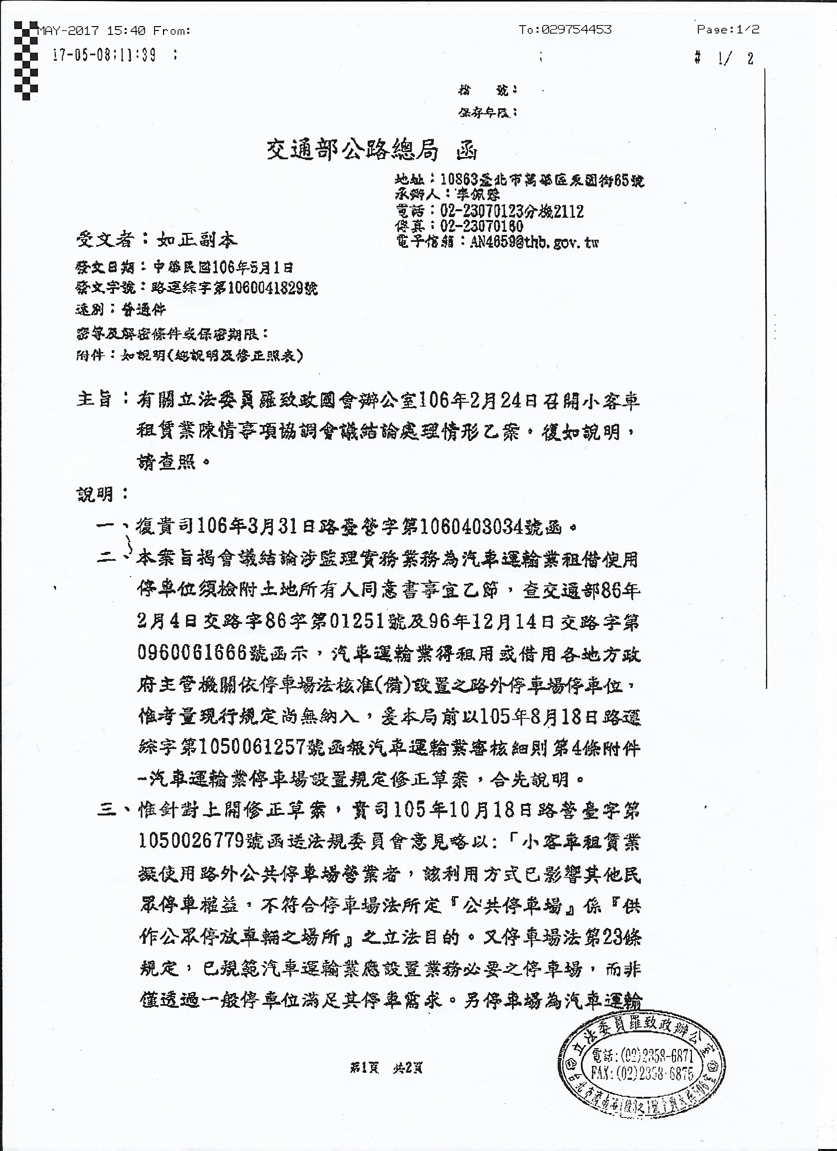 各位會員先進,經各位前輩長期的努力之下,今針對困擾本會已久"虛擬停車場"的問題已經有一重大突破,承羅致政委員大力協助之下交通部公路總局完全同意我們租用路外停車場可免具"地主同意書",並已將相關修正草案送審,實乃本業一大福音,本會再第一時間收到此文,即刻將此好消息供佈給各位會員先進分享!!!