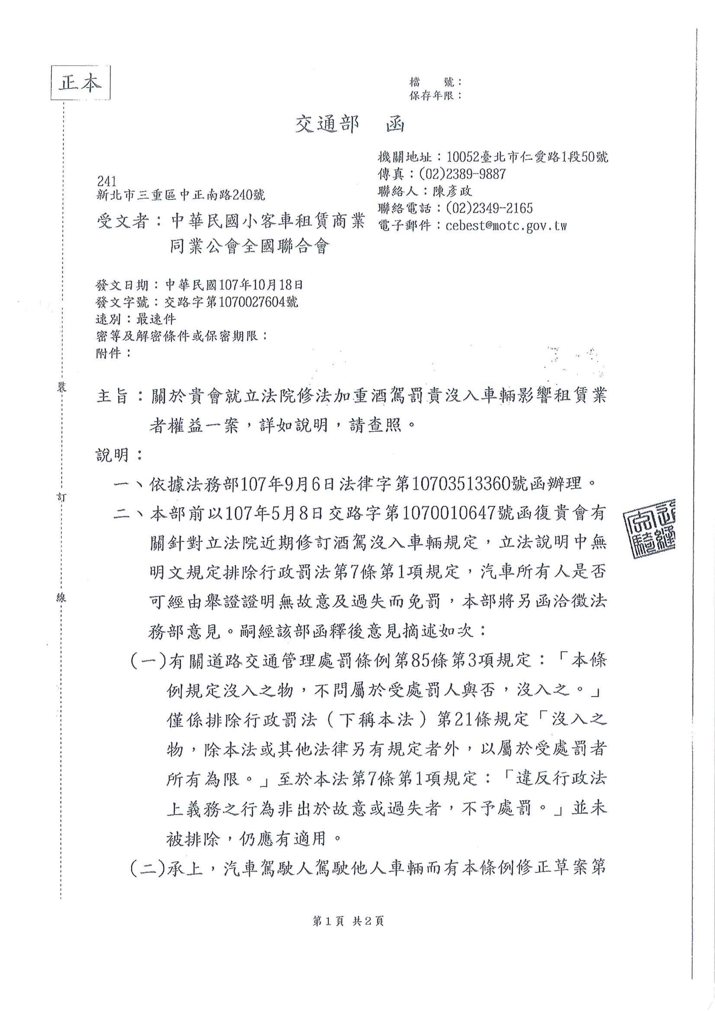 函轉全聯會之交通部回復有關本業就立法院修法加重酒駕罰則車輛影響本業權益辦理情形