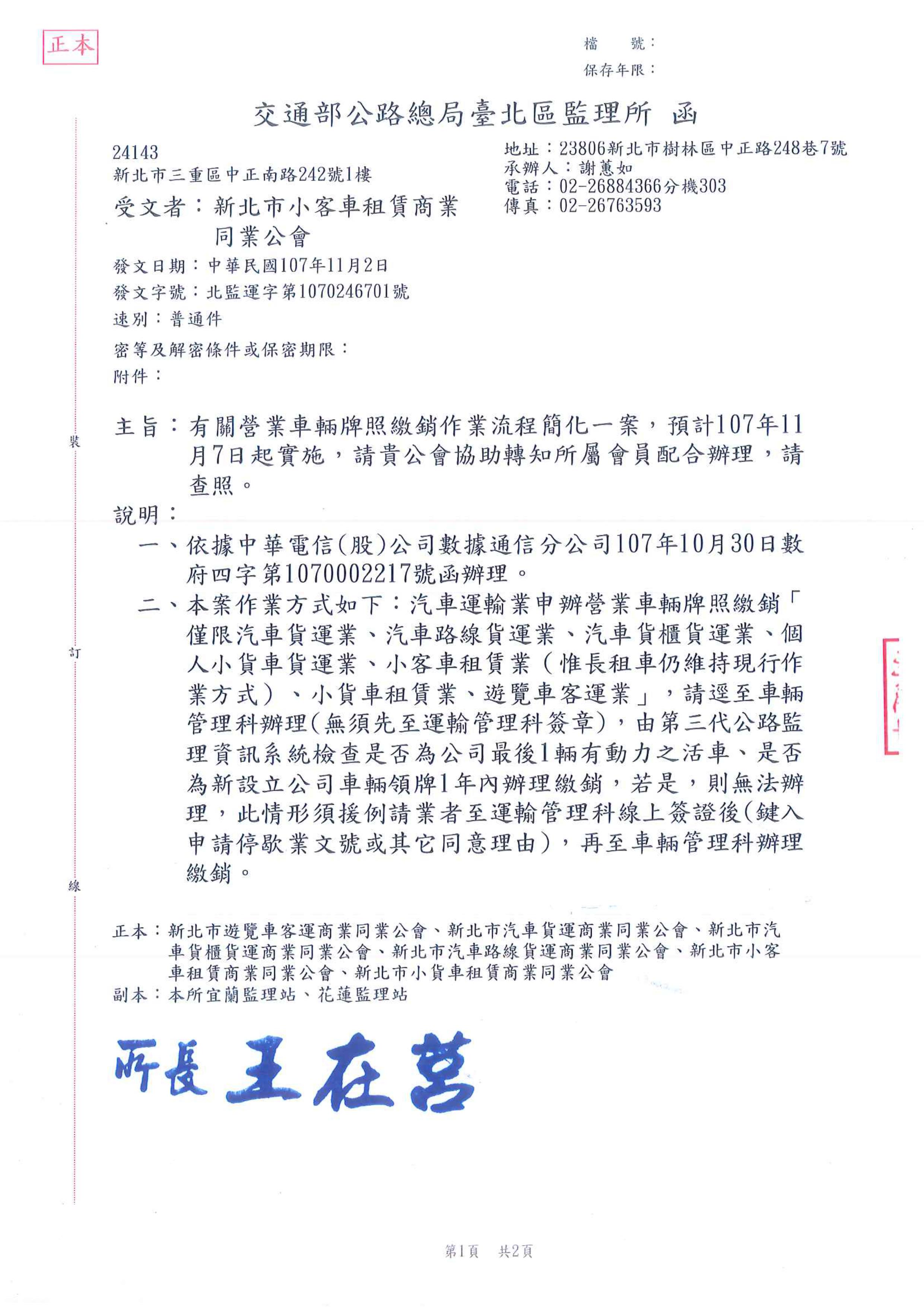 有關本業車輛牌照繳銷作業流程簡化一案