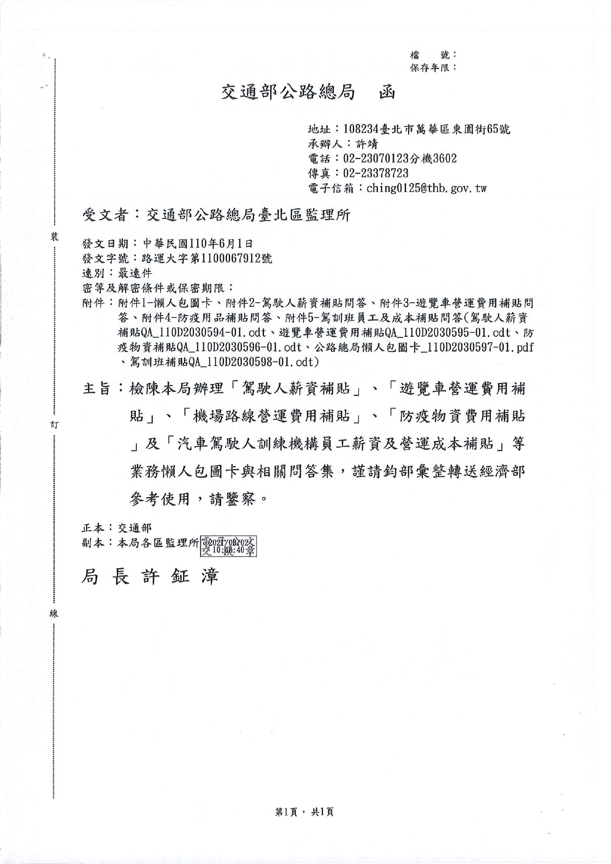 函轉交通部台北區監理所有關各類補貼等業務懶人包圖卡與相關問答集資料各1份轉知會員知悉