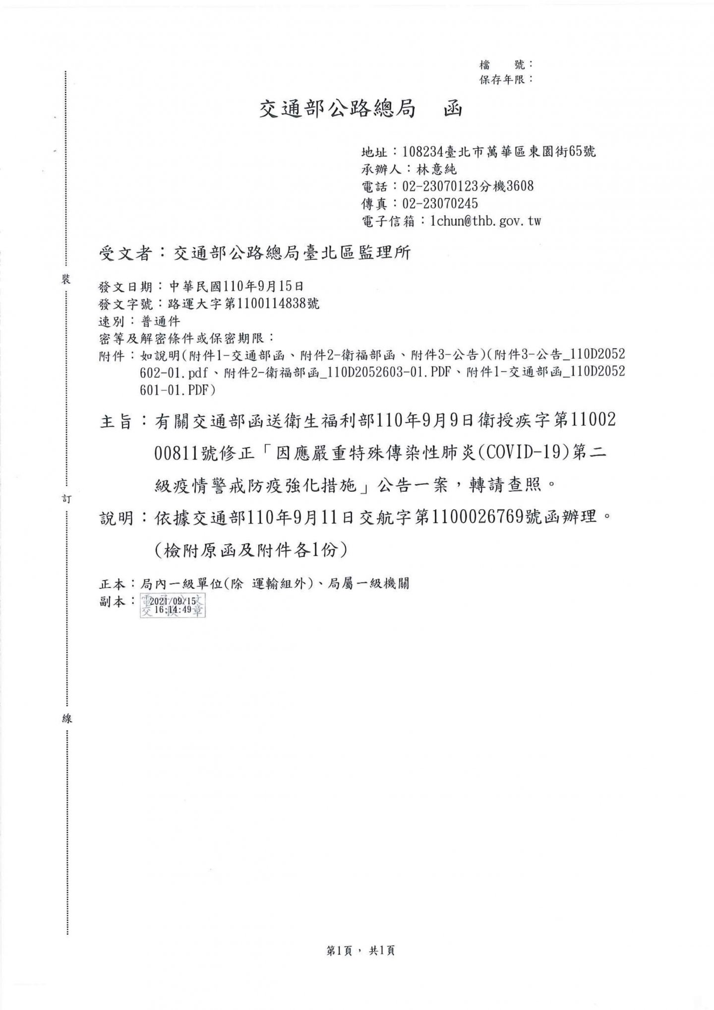 函轉衛服部110年9月9日衛授疾字第1100200811號修正第二級疫情警戒防疫強化措施公告1份轉知會員知悉