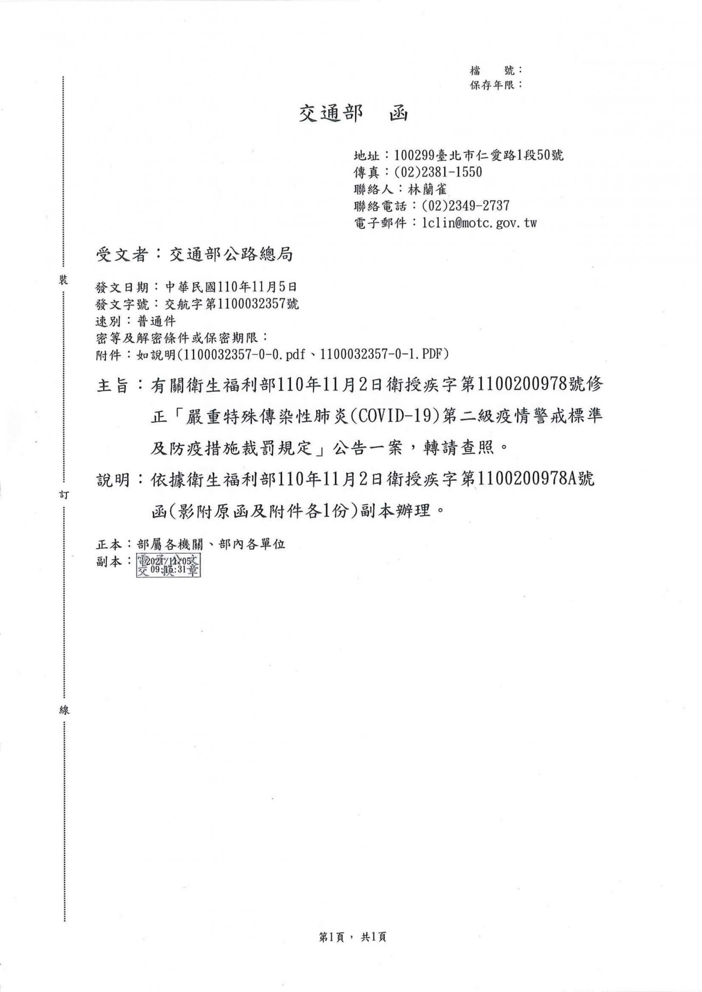 函轉交通部公路總局110年11月11日因應嚴重特殊傳染性肺炎警戒標準及防疫措施裁罰規定