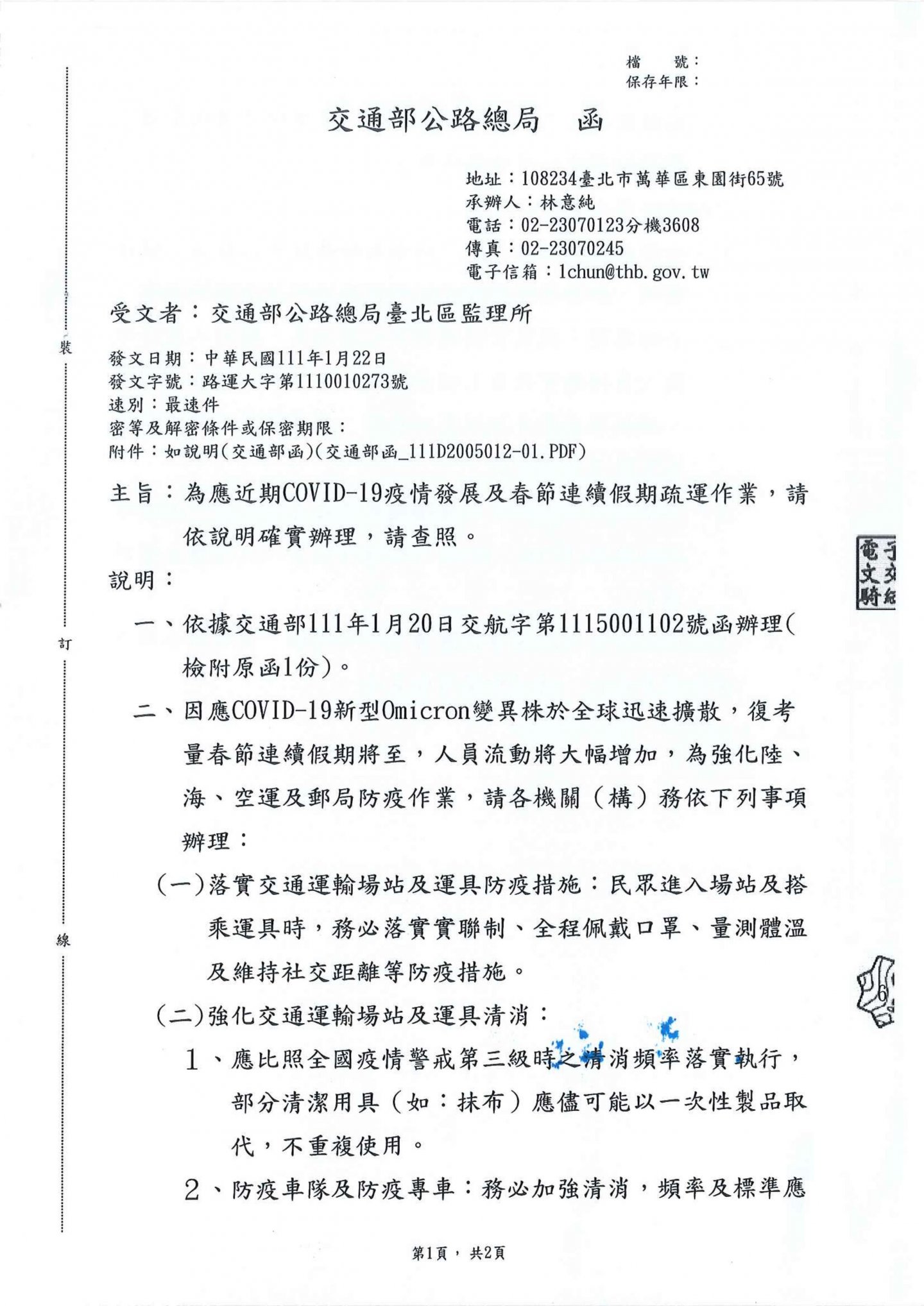 為應近期COVID-19疫情發展及春節連續假期疏運作業請依說明確實辦理