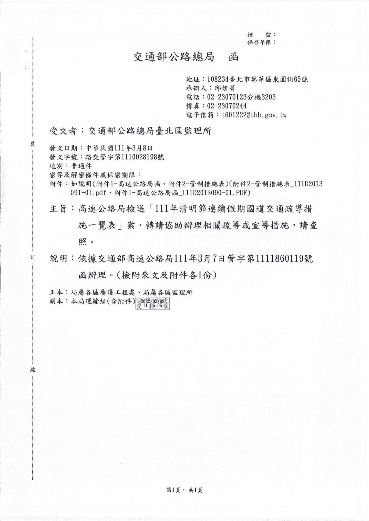 函轉高公局檢送111年清明連假國道交通疏導措施一覽表