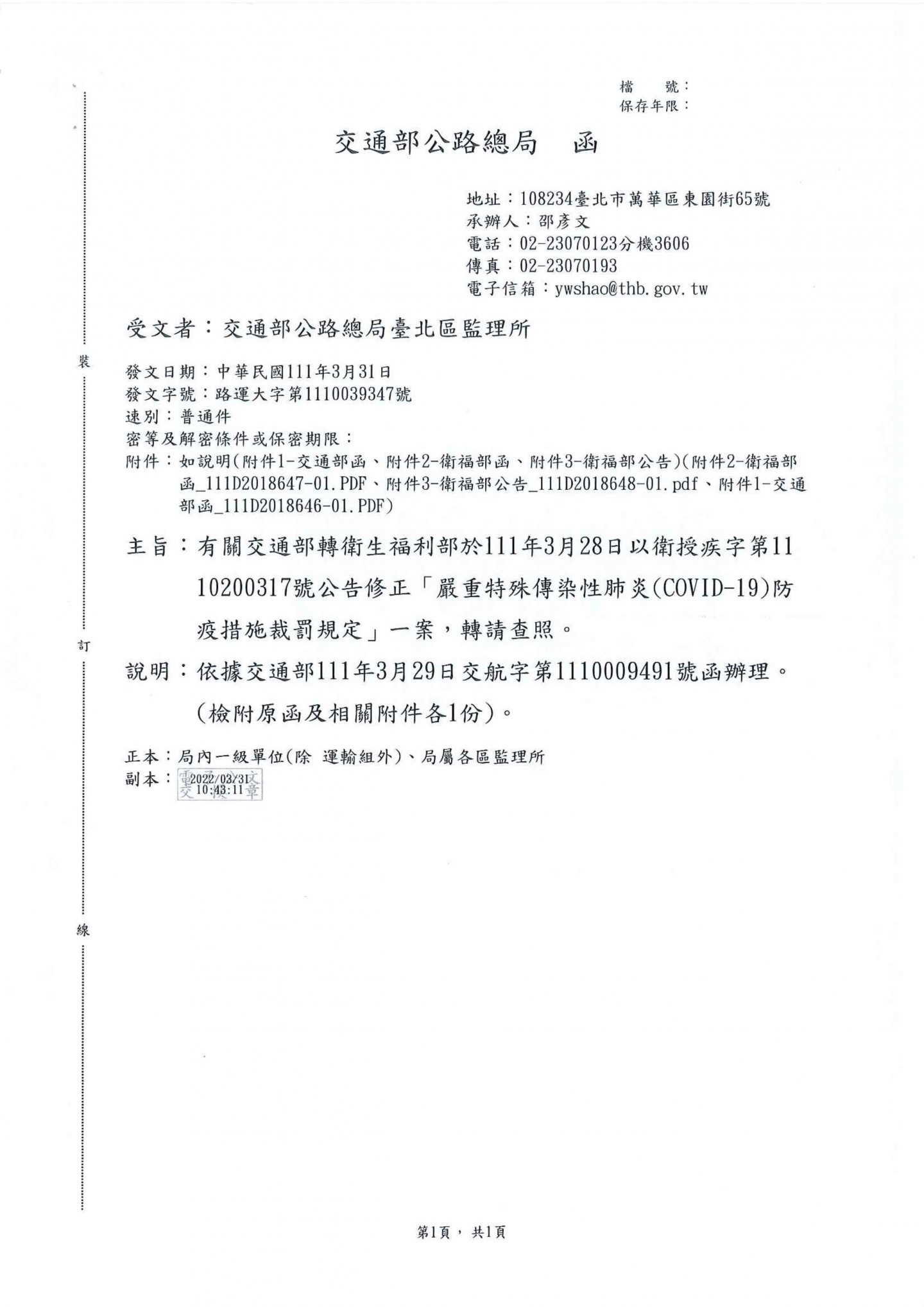 函轉衛服部111年3月28日衛授疾字第1110200317號修正防疫措施裁罰規定1份轉知會員知悉