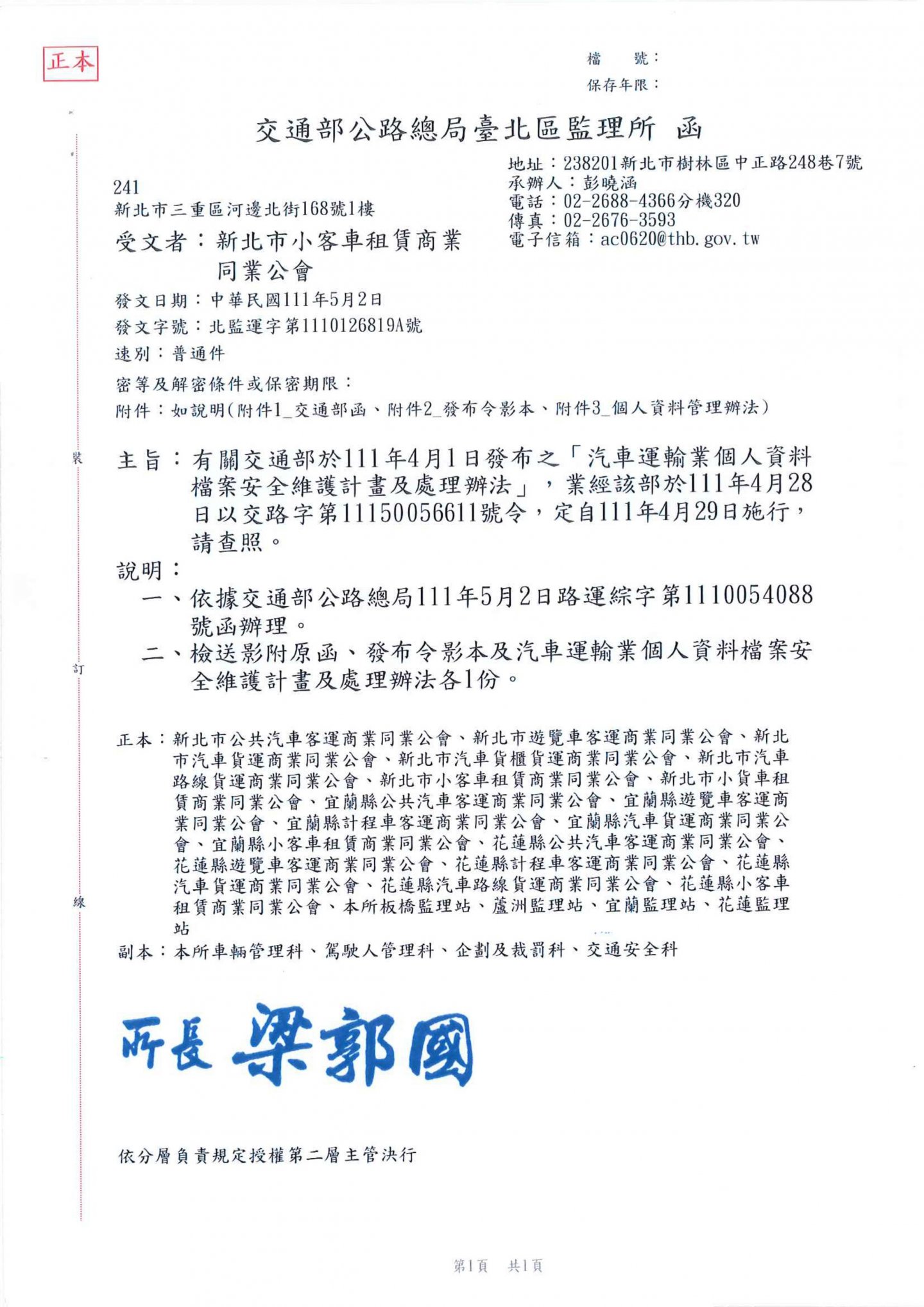 有關交通部於111年4月1日發布之汽車運輸業個人資料檔案安全維護計畫及處理辦法訂自111年4月29日施行