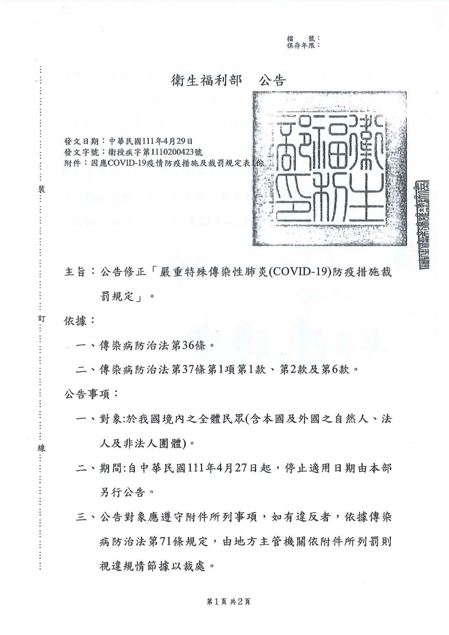 函轉衛服部111年4月29日衛授疾字第1110200423號修正防疫措施裁罰規定1份轉知會員知悉