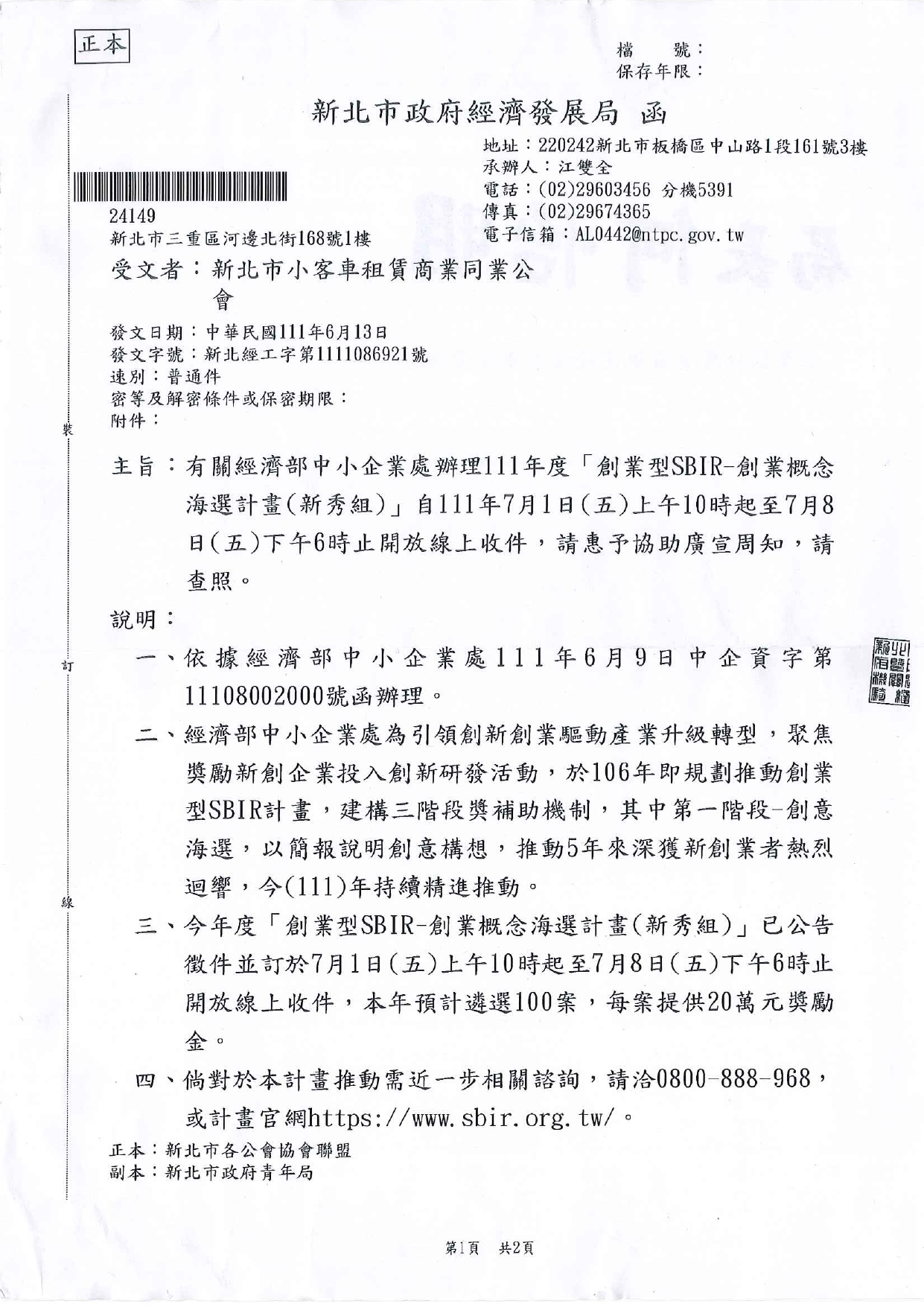 有關經濟部中小企業處辦理111年度創業型SBIR-創業概念海選計畫(新秀組)至7月8日下午6時止開放線上收件