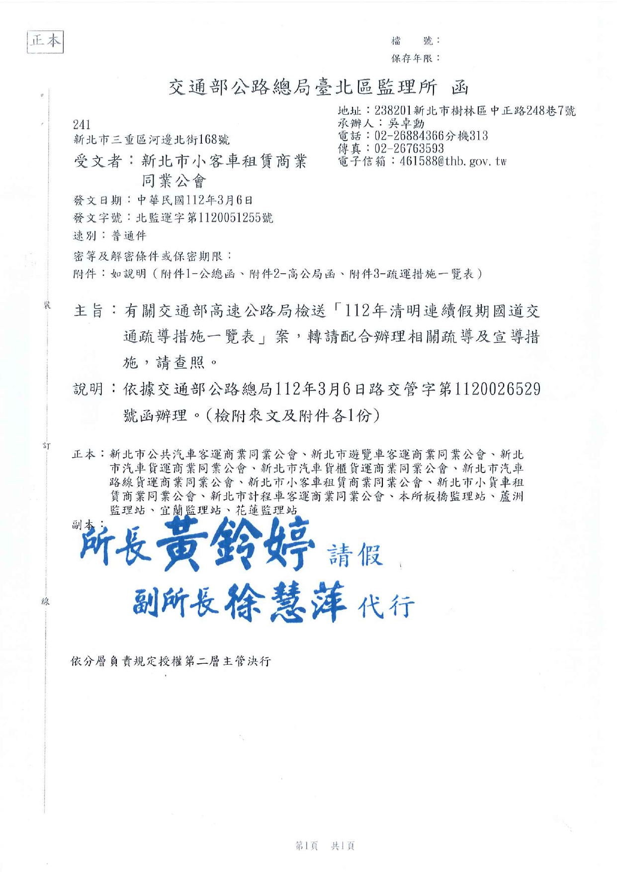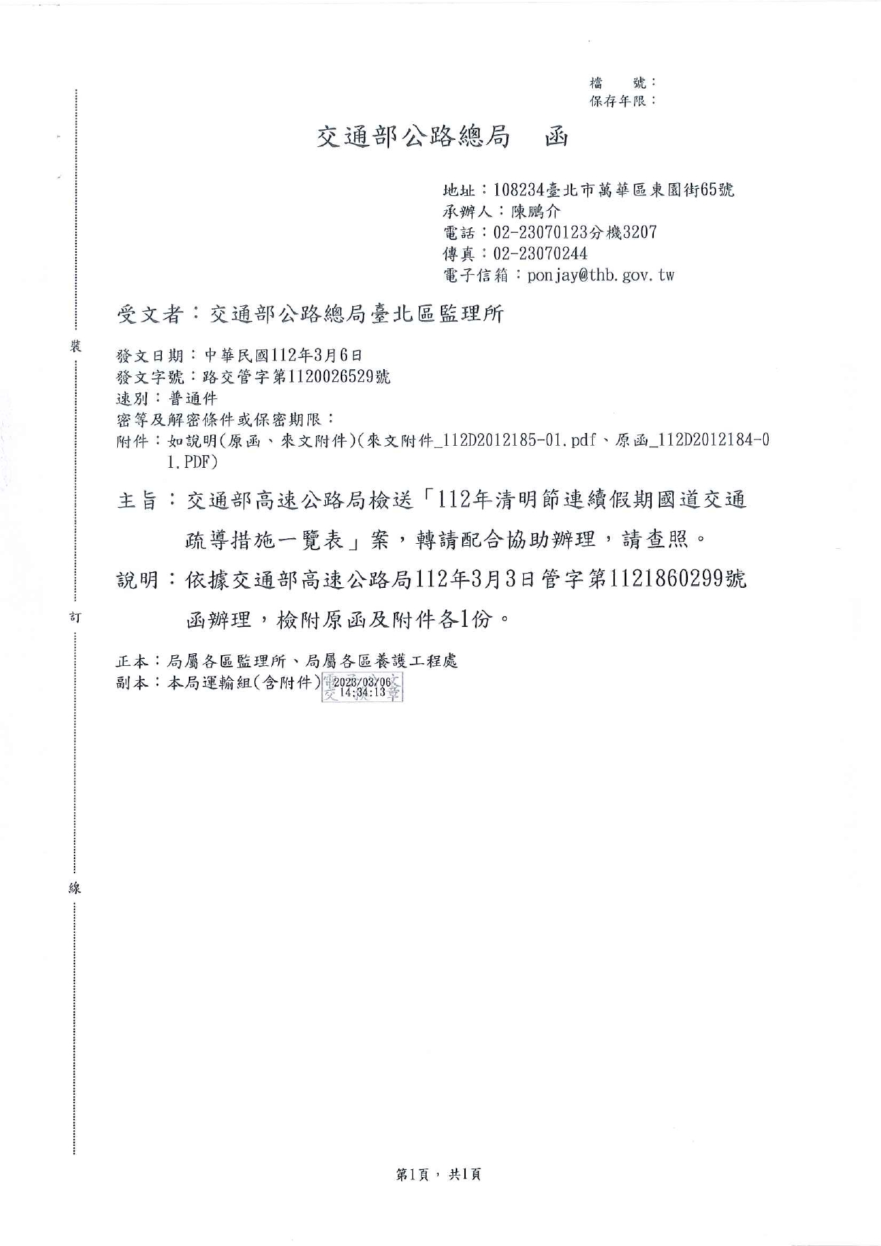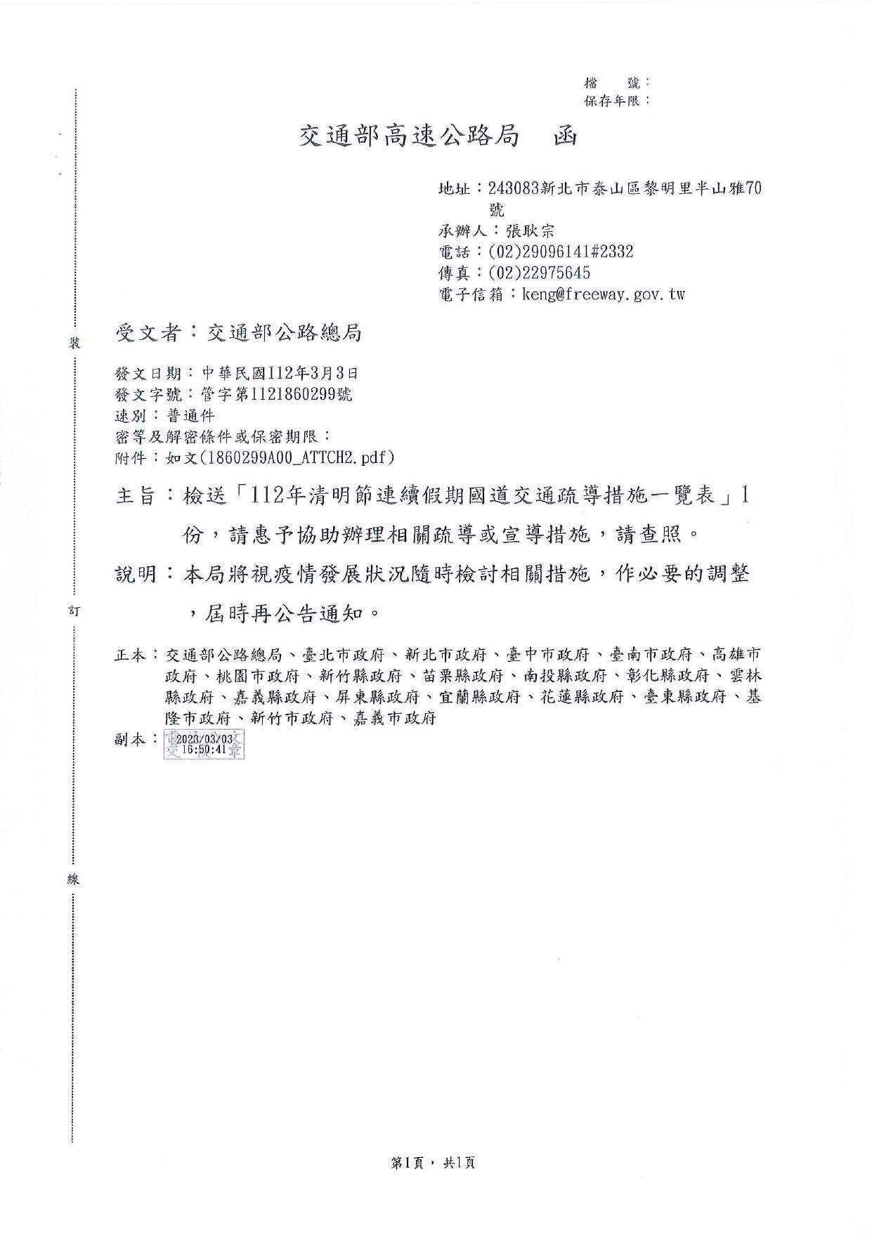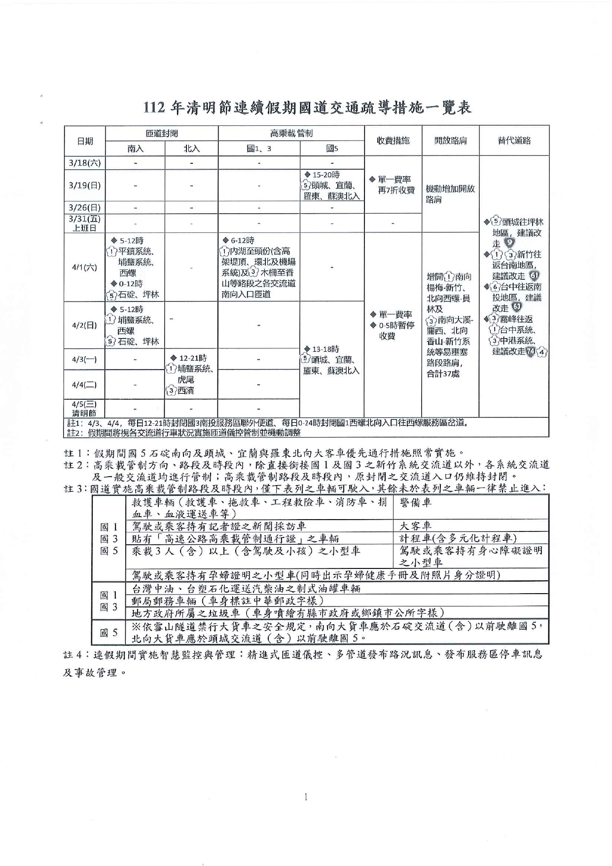 有關交通部高公局檢送112年清明連續假期國道交通疏導措施一覽表轉知會員知悉