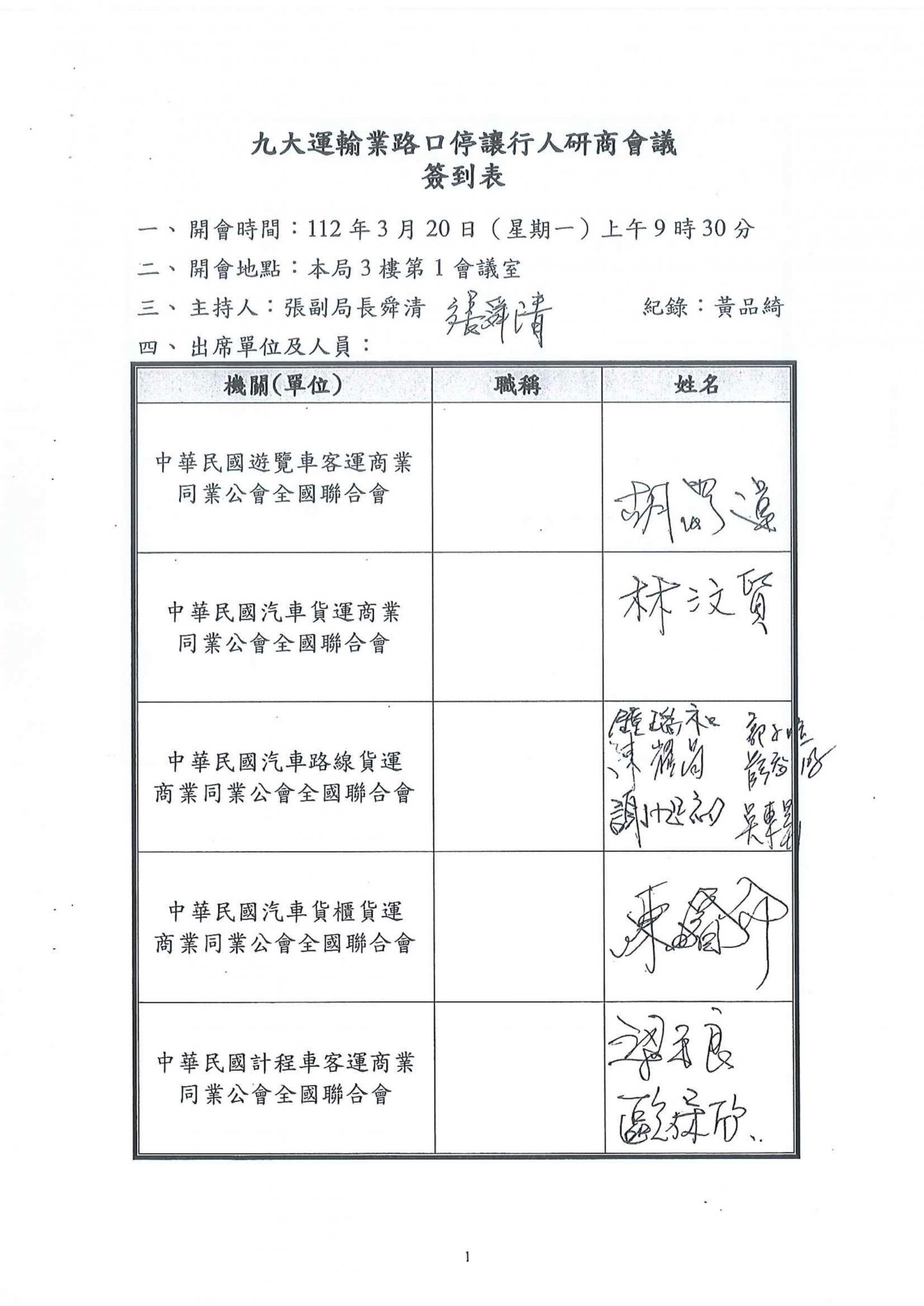 函轉台北區監理所有關公路總局112年3月20日召開九大運輸業路口停讓行人研商會議紀錄一案