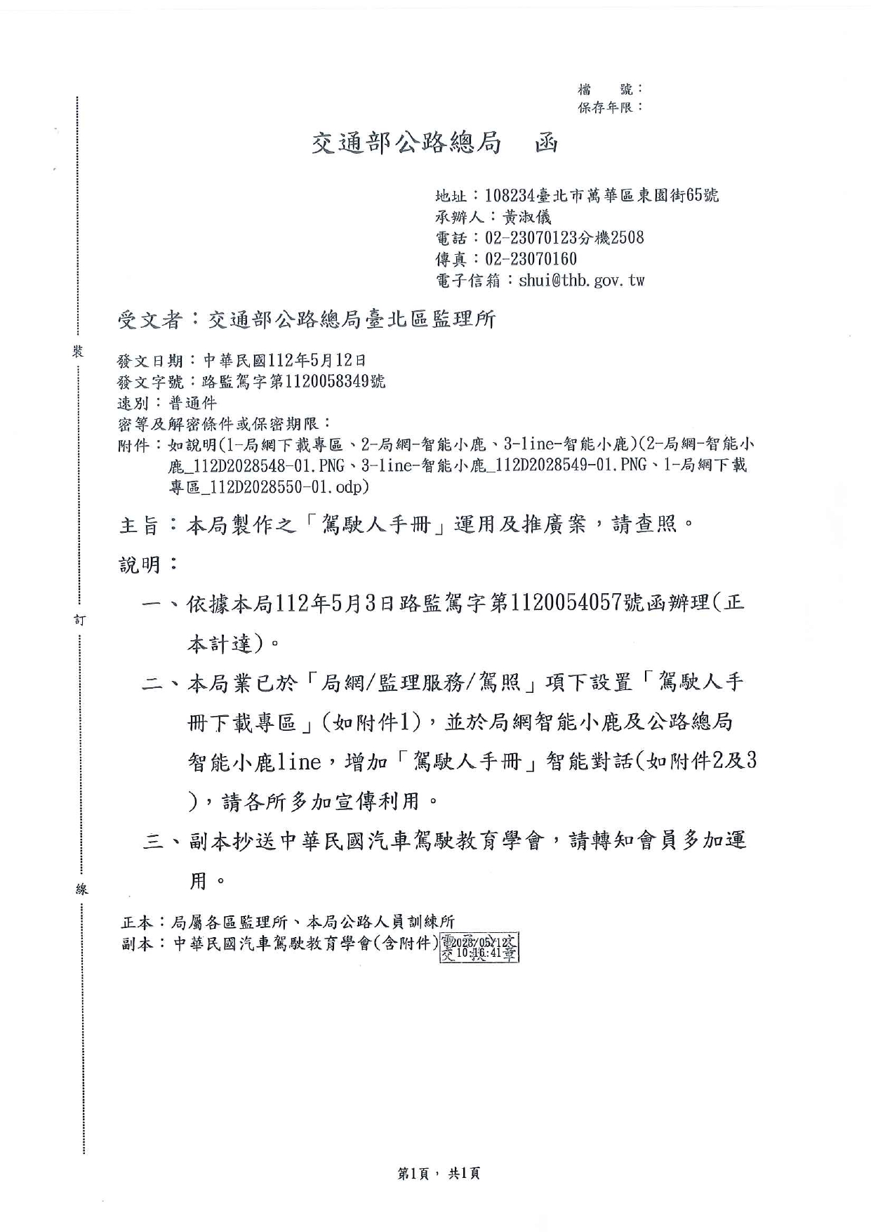 函轉公路總局製作之駕駛人手冊轉知會員知悉