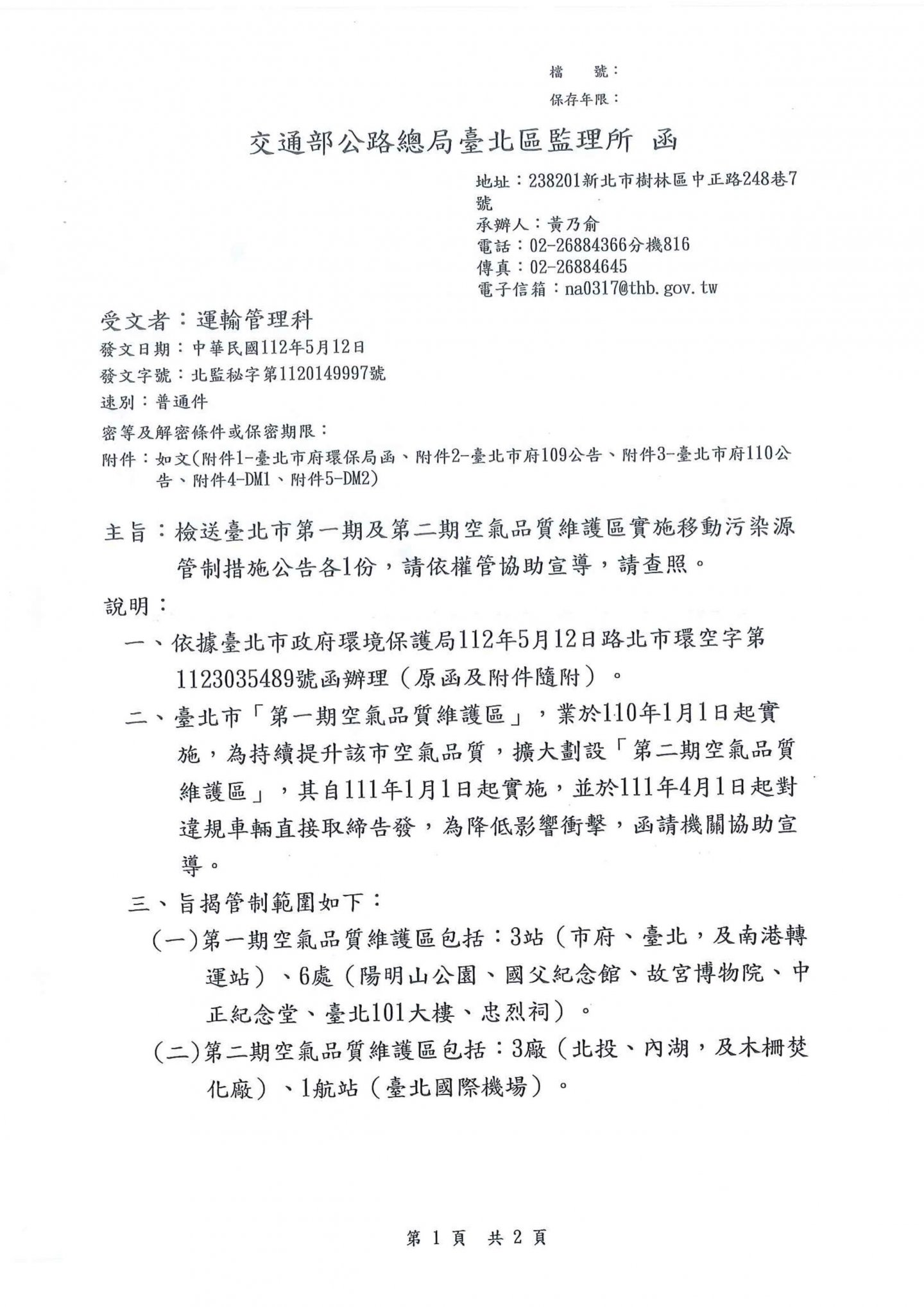 函轉台北區監理所檢送台北市第一期及第二期空氣品質維護區管制措施公告轉知會員知悉