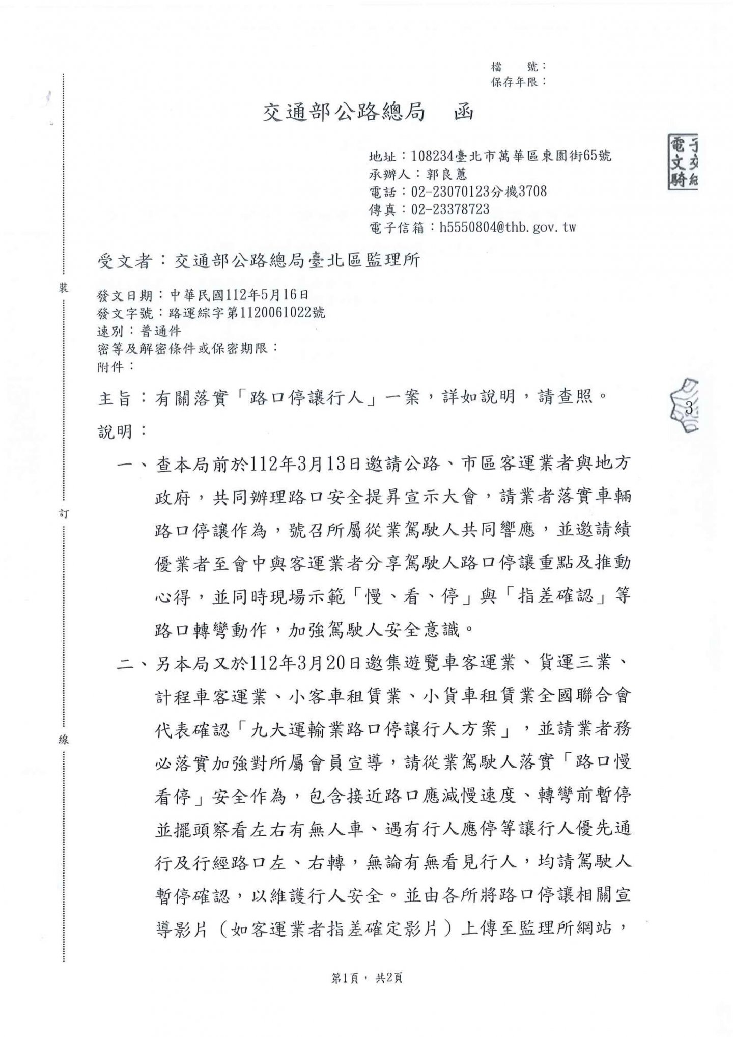 函轉台北區監理所有關落實路口停讓行人一案轉知會員知悉
