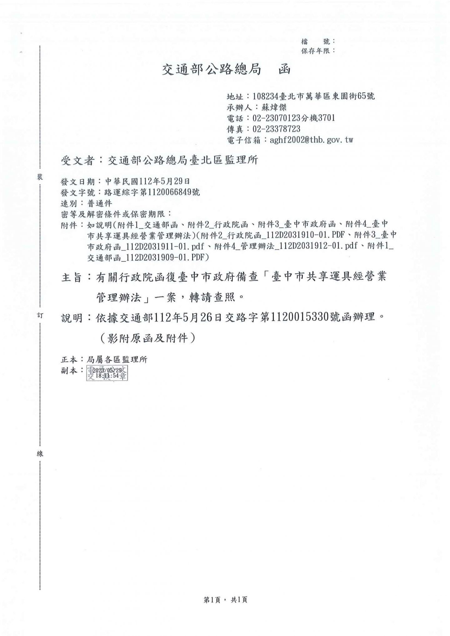 函轉行政院備查屏東縣共享運具經營業管理辦法一案轉知會員知悉