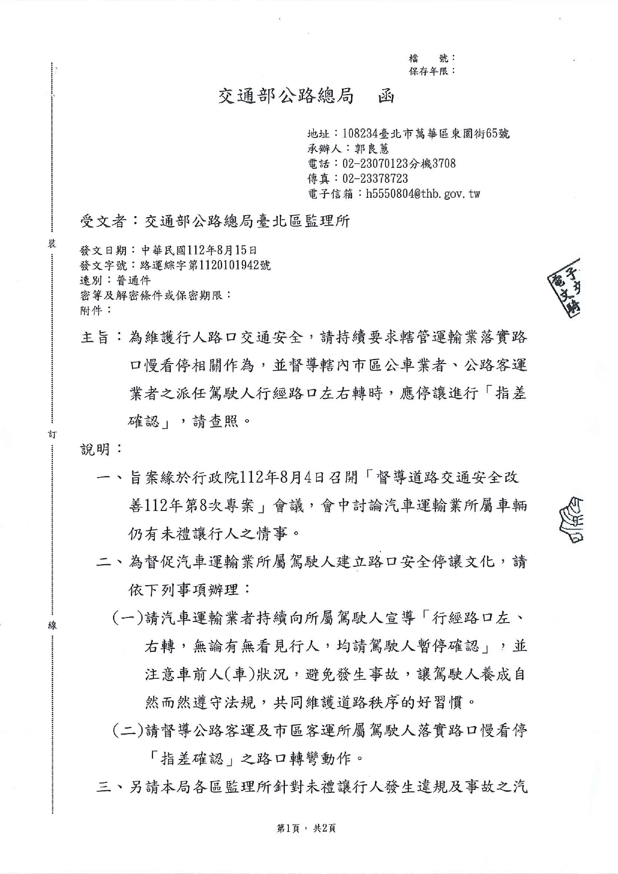 有關交通部公路總局函轉為維護行人路口交通安全轉知會員知悉