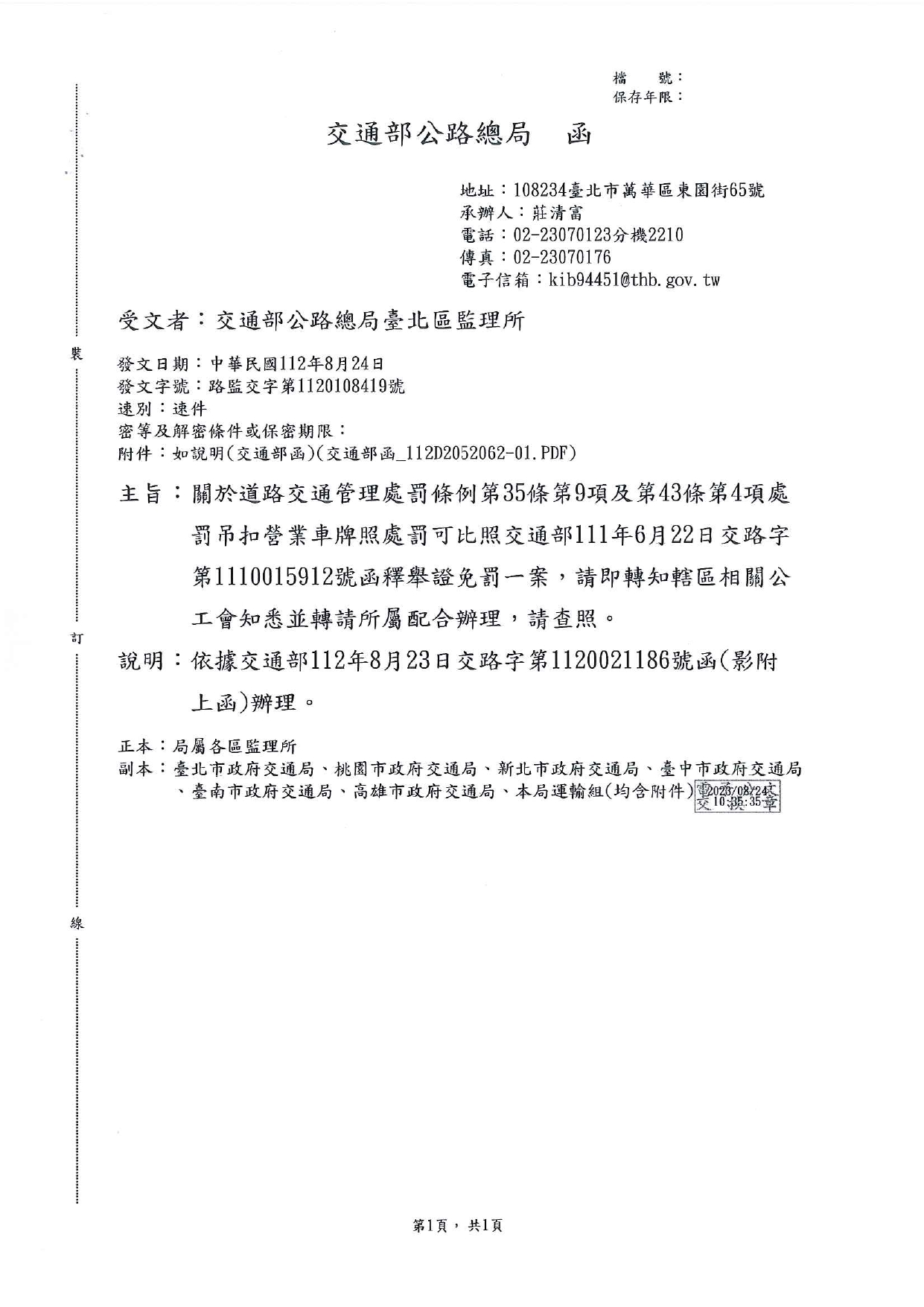 函轉台北區監理所關於道路交通管理處罰條例處罰吊扣營業車牌處罰可比照交部第1110015912號函釋舉證免罰一案
