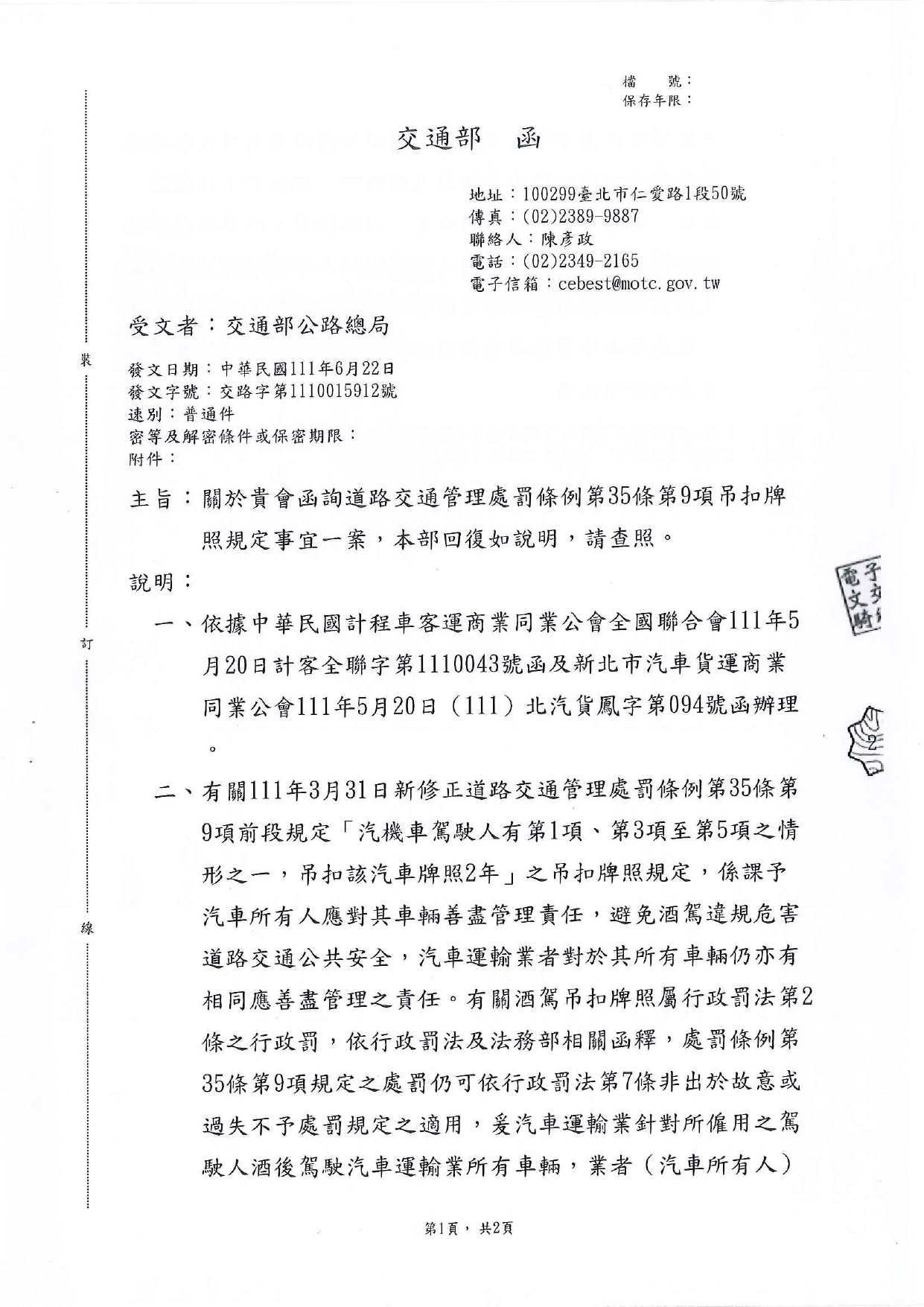 道路交通管理處罰條例第35條第9項及第43條第4項處罰吊扣營業車牌照處罰一案