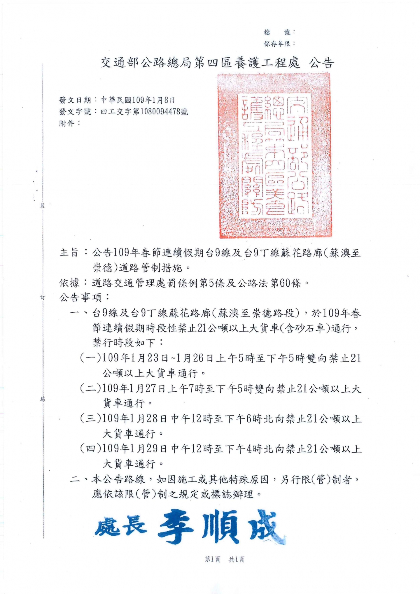 109年春節連續假期台9線及台9丁線蘇花路廊(蘇澳至崇德)道路管制措施